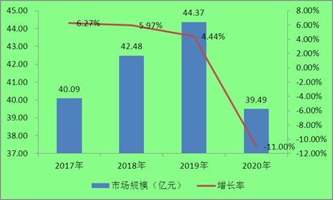 镍氢电池是早期的镍镉电池的替代产品,在电化学特性方面与镍镉电池基本相似,且释放能量强,不含有毒物质,可实现对镍镉电池的替代。尽管锂离子电池对镍氢电池又产生了比较大的替代效应,但镍氢电池凭借性能稳定、工艺成熟的优势,客户在某些领域如安防和医疗等行业依然喜欢应用镍氢电池,2019年行业市场规模约为44.37亿元,受疫情影响,2020年行业市场规模略有下降,为39.49亿元。