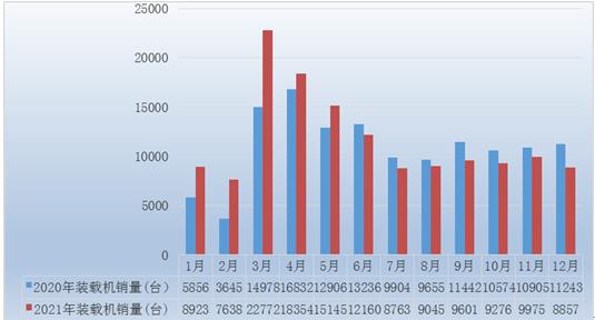 2021年2021年,共销售各类装载机140509台,同比增长7.11%。其中3吨及以上装载机销售128144台,同比增长4.21%。总销售量中国内市场销量106501台,同比下降0.07%;出口销量34008台,同比增长38.2%。