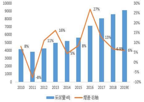 图表:我国采浆量以及增速(单位:吨,%)
