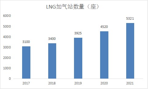 图表:2017-2021年国内LNG加气站数量走势(单位:座)