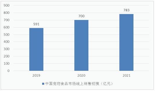 宠物食品品牌通过在线上和线下不同维度进行营销投放与战略布局,从多个角度达到提高品牌力的效果:在线上通过网络营销制造热度,借助广告植入等方式对目标客群进行精准投放,利用IP合作等营销手段在线上提高品牌知名度。线上+线下融合,通过覆盖线上渠道+线下终端的形式达成规模效应,提高市占率,在增强消费者粘性的同时拓客。进行线下连锁布局,通过线下实体服务方式抓牢用户,吸引新客户。因此中国宠物食品市场线上销售规模在销售总量上面占比很大。2019年宠物食品市场线上销售规模591亿元,2021年线上销售规模达到783亿元。