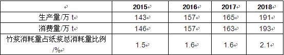 据统计,2015—2018年我国竹浆生产量和消费量如表所示,2015-2017年竹浆消耗量占纸浆总消耗量的比例基本维持不变,2018年占比提升到2.1%,一方面是因为我国纸浆消耗量有所减少,另一方面是因为我国竹浆消费量大幅提升。
