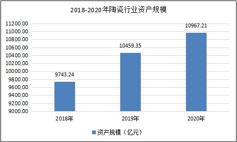 据数据显示,2018年陶瓷行业资产规模为9743.24亿元,2019年陶瓷行业资产规模为10459.35亿元,2020年陶瓷行业资产规模为10967.21亿元,同比增速为4.85%。