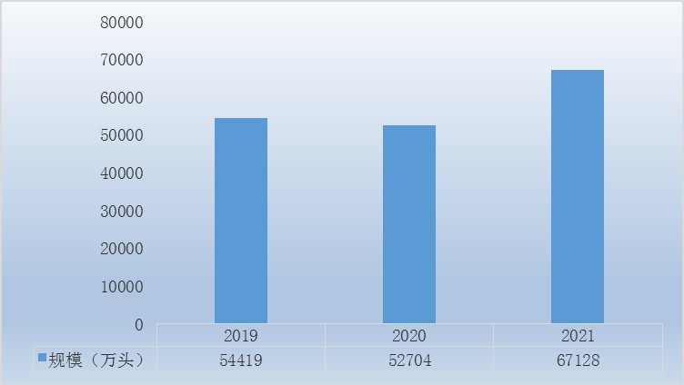 2017年全国生猪出栏68861万头;2018年我国共出栏生猪69382万头;2019年生猪出栏54419万头。2021年全国生猪出栏67128万头,相较于2020年的不足5.3亿头,大幅增长27.4%。