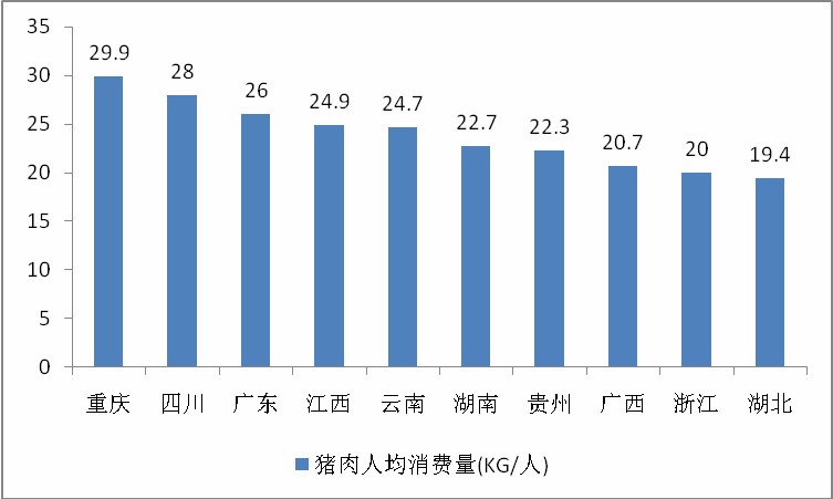 国家统计局数据显示,猪肉人均消费量最多的地方是重庆,为29.9千克/人,是广东、四川,猪肉人均消费量分别为:28千克/人、26千克/人。