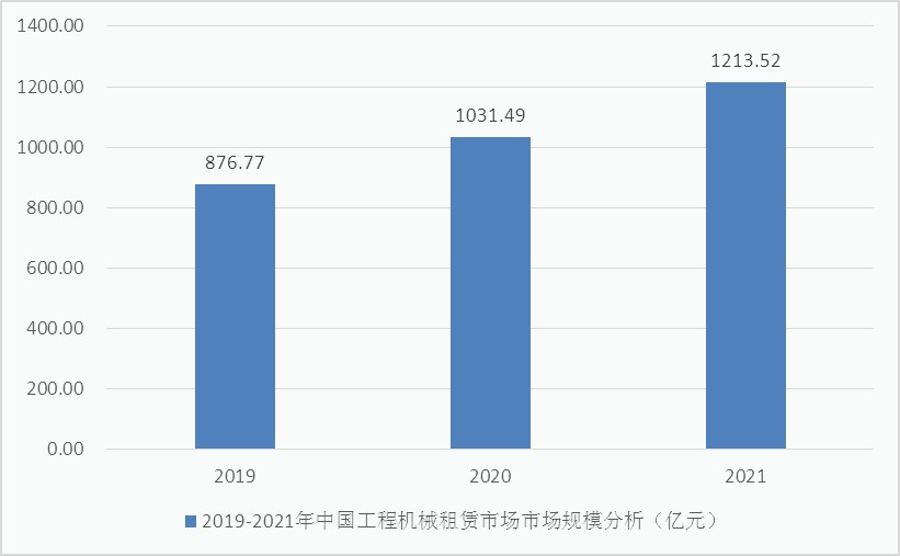 2019年的中国工程机械租赁市场是876.77亿元,并且在2021达到了1213.52亿元。