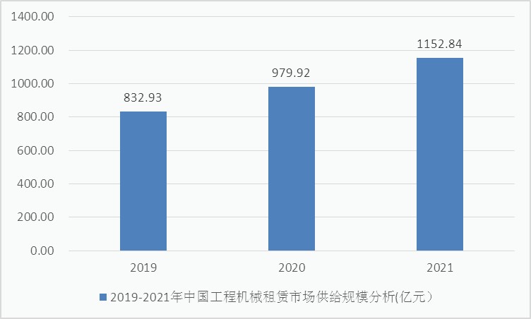 2019年的中国工程机械租赁供给市场是832.93亿元,并且在2021达到了1152.84亿元。