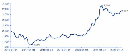 图表:2016-2022年玉米价格(单位:元/吨,截至日期2022年4月20日)