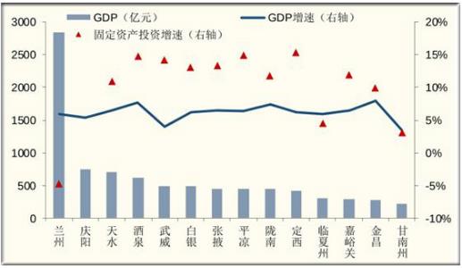 地级市层面,从已获数据的角度看,甘肃省2019年GDP总量位列前三的分别为兰州市(2837.4亿)、庆阳市(742.9亿)和天水市(702.5亿),嘉峪关市(283.4亿)和金昌市(271.5亿)GDP总量小于300亿;GDP增速方面,金昌市(8.0%)和酒泉市(7.7%)位列前位,庆阳市(5.3%)和武威市(4.0%)较靠后;固定资产投资增速排在前三位的为兰州市(18.8%)、嘉峪关市(16.5%)和天水市(15.4%),庆阳市(-2.3%)、张掖市(-7.1%)和酒泉市(-17.6%)增速为负。