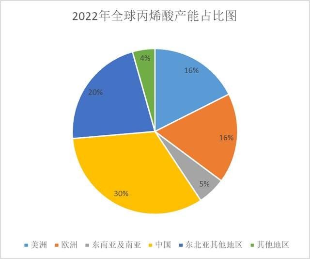 目前,全球丙烯酸产能接近900万吨,其中大约20%的产能来自东北亚其他地区,30%来自于中国,16%来自美洲、16%来自欧洲,5%来自东南亚及南亚,4%来自其他地区。2022年.全球除亚洲地区以外没有丙烯酸新装置投产,在现有产能中,35%左右的产能在2000年以前投放,其中更有近一半的装置投产时间已经超过40年。装置运行年限越久,意味着其发生故障及产能利用不足的概率就越高,反观中国,在运行的丙烯酸装置投产年限基本都在2000年以后,而从产能占比来看中国占据全球近4成,中国丙烯酸行业在未来有较好的出口基础。