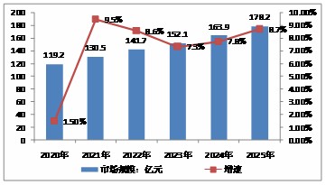 由于疫情的显著影响,预计2020年的市场规模为119.2亿元,同比增长大约1.50%。随着经济恢复增速,预计到2025年市场规模将达到178.2亿元,2020-2025年年均增速将保持在8%左右。
