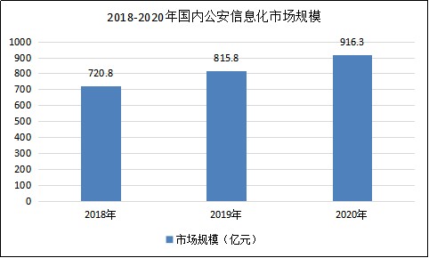 据数据显示,2018年国内公安信息化市场规模为720.8亿元,2019年国内公安信息化市场规模为815.8亿元,2020年国内公安信息化市场规模为916.3亿元,同比增速为12.32%。