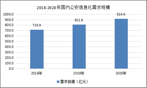 据数据显示,2018年国内公安信息化需求规模为714.9亿元,2019年国内公安信息化需求规模为811.6亿元,2020年国内公安信息化需求规模为914.9亿元,同比增速为12.72%。