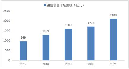 根据工信部数据统计,2017-2021年通信设备行业呈现逐年增长趋势,2020年受疫情影响增长趋势有所放缓,2021年通信设备行业市场规模为2100亿元,较2017年增长116.7%。