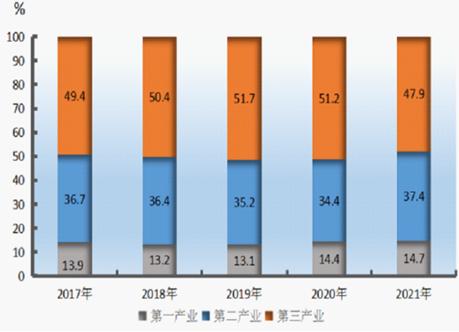 图表:2017-2021年三次产业增加值占地区生产总值比重