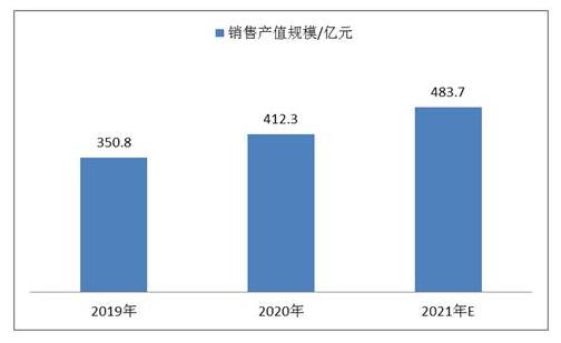 图表:2019-2021年中国训练健身器材行业销售收入规模情况