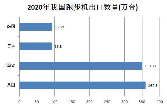 2020年我国跑步机共出口至183个国家或地区。其中,出口至美国和台湾省的数量排名前二,出口量都突破了300万台,分别为360.3万台、350.33万台。其次是日本和韩国,出口数量为93.8万台和93.39万台。
