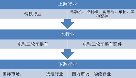 电动三轮车行业的上游为生产电动车原材料的企业,主要包括生产蓄电池、车架、电机及其他辅助材料的生产厂商及各类钢铁材料生产厂商。下游市场方面,电动货运三轮车主要用于货运和物流业。