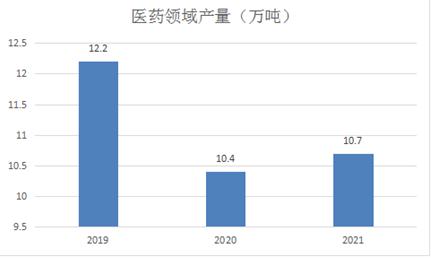 2020年,我国丁二酸酐生产企业受新冠疫情影响,部分地区丁二酸酐生产企业在疫情防控管制下产量有所下降,截至2020年底,我国丁二酸酐产量在医药领域由2019年的12.2万吨下降至为10.4万吨,2021年行业在全国经济快速复苏背景下,我国丁二酸酐产量恢复至为10.7万吨。