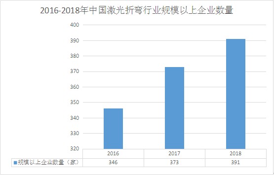 激光折弯快速、柔性化制造技术的需求不断提出,采用激光弯曲技术直接成形特定曲面成为激光弯曲成形发展的重要方向之一。激光折弯行业规模以上企业数量约有391家,数量有一定的增长。