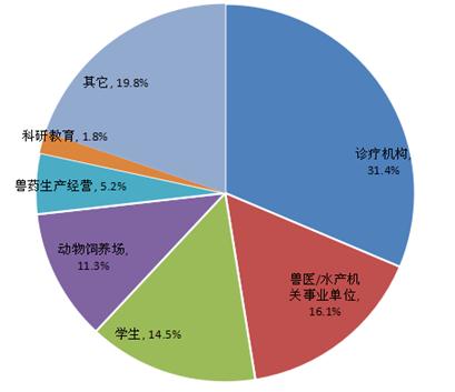 在我国执业兽医考试中,有31.38%的考生来自于诊疗机构,16.08%的考生来自于兽医/水产机关事业单位。5.20%的考生来自于兽药生产经营企业。