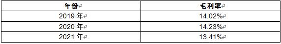 2019年新能源汽车电池扎带毛利率为14.02%,2020年毛利率为14.23%,2021年毛利率下降至13.41%。