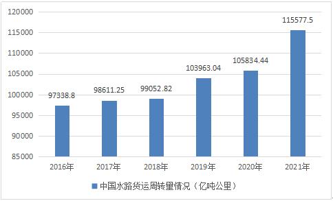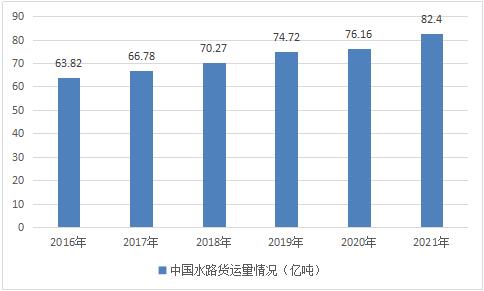 2020年中国水路完成货物运输量76.16亿吨,同比下降3.3%,完成周转量10.58万亿吨公里,同比下降2.5%;2021年中国水路完成货物量82.4亿吨,同比增长8.2%,完成周转量11.55万亿吨公里,同比增长9.2%。