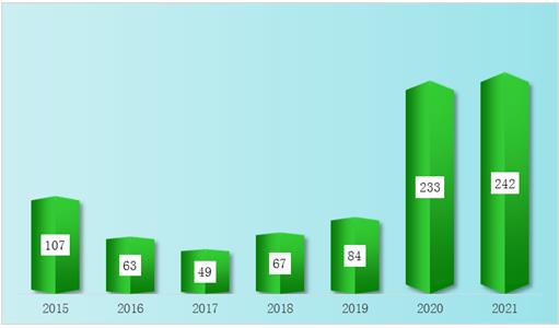 图表:2015-2021年中国风电齿轮箱市场规模(亿元)
