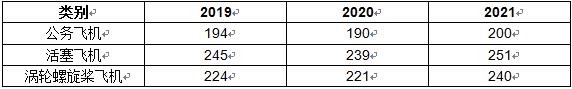 2021年,美国通用飞机出口中,活塞式飞机为251架,占全部出口的36.32%,其中单引擎飞机为211架,多引擎飞机为40架。涡轮机螺旋桨式飞机出口240架,占比34.73%,公务机为200架,占比28.94%。
