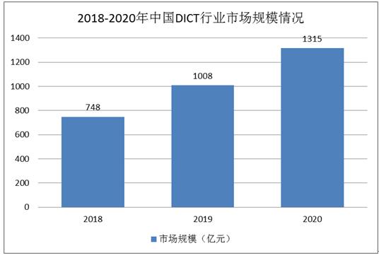 近年来,云网融合、物云融合引领DICT和物联网快速发展。2020年,国内DICT行业市场规模约为1315亿元,较2019年增长了30.46%。