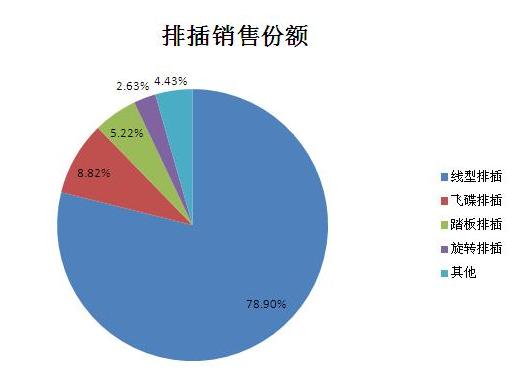 排插按结构样式划分,一般划分为:线型排插、飞碟排插、踏板排插、旋转排插等。其中,线型排插仍是我国排插主流产品,销售额份额约占78.9%;飞碟排插能有效避免插口被插头覆盖情况,销售额约占8.82%;踏板排插对不方便弯腰的人可提供很大便利,但在我国市场销售额比例不高仅5.22%左右;旋转排插的其中一排插门可以排插为轴做90度旋转,能避免过大插头覆盖住柑临插口情况,该排插销售额约占2.63%左右。