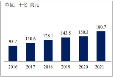 图表:2016-2021年全球抗肿瘤药行业市场规模