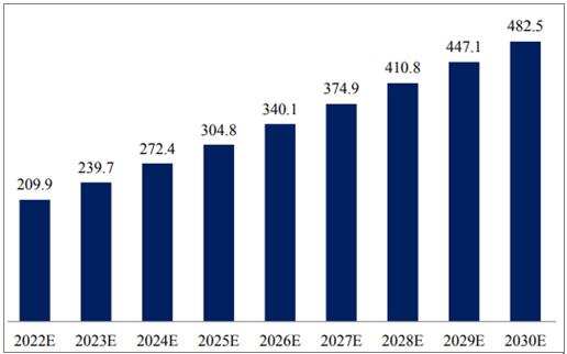 图表:2022-2030年全球抗肿瘤药物市场规模预测(十亿美元)