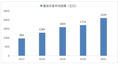 根据工信部数据统计,2017-2021年通信设备行业呈现逐年增长趋势,2020年受疫情影响增长趋势有所放缓,2021年通信设备行业市场规模为2100亿元,较2017年增长116.7%。