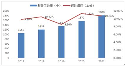 图表:2017-2021年通信设备行业新开工项目数量及增长率