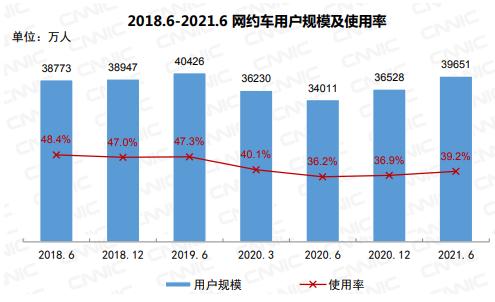 截至2021年6月,我国网约车用户规模达3.97亿,较2020 年12月增长3123 万,占网民整体的39.2%。