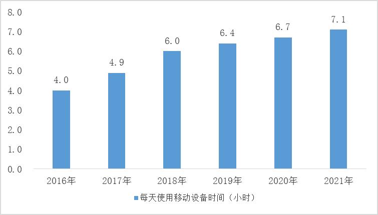 图表:2016-2021年中国用户每天使用移动设备时间