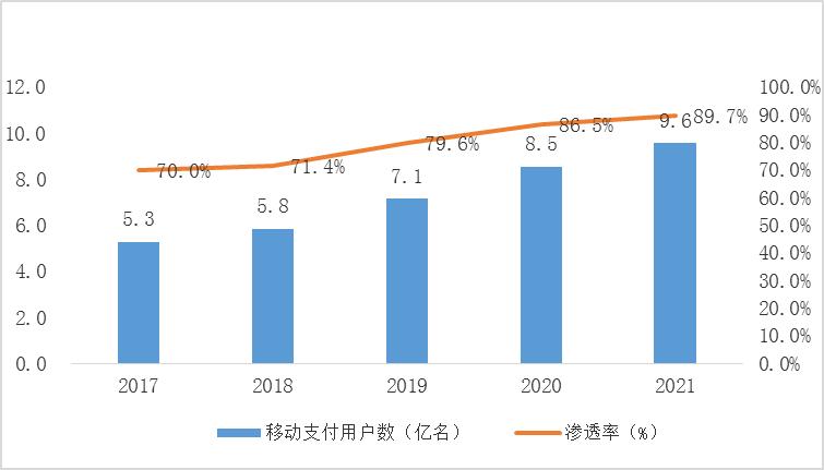 图表:2017-2021年中国移动支付用户数及渗透率