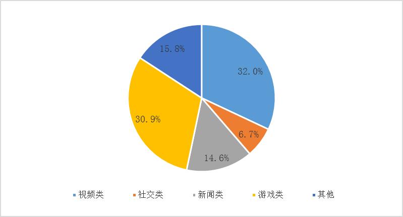 中国用户常用应用程序按应用类别划分为五类:视频类、社交类、其他、新闻类、游戏类应用程序。2020年中国用户每天在视频类应用程序花费的时间比例最大,为32.0%。其次为游戏类、其他、新闻类、社交类应用程序,占比分别为30.9%、15.8%、14.6%、6.7%。