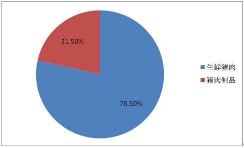 猪肉为世界各地最常见的消费肉品。目前猪肉市场中主要为生鲜猪肉,占整体的78.5%。猪肉制品占比较少,仅有21.5%。