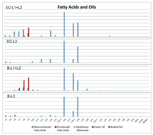 耳杯和漆箱中干性油的裂解产物(EC-L1+L2:耳杯的底漆层和颜料层;EC-L3:耳杯的灰层;B-L1+L2:漆箱的底漆层和颜料层;B-L3:漆箱的灰层)