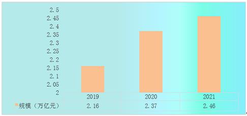 2019-2021年中国人力资源服务行业市场规模由2.16万亿元上升到2.46万亿元。