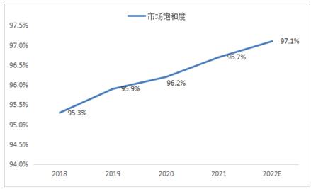 根据市场调研数据分析,2018-2022年PTMEG行业市场饱和度呈现逐年增长趋势,2018年PTMEG行业市场饱和度达95.3%,预计2022年PTMEG行业市场饱和度为97.1%,较2018年上升1.8%。