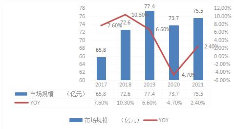 图表:2017-2021年我国真空镀膜市场规模情况
