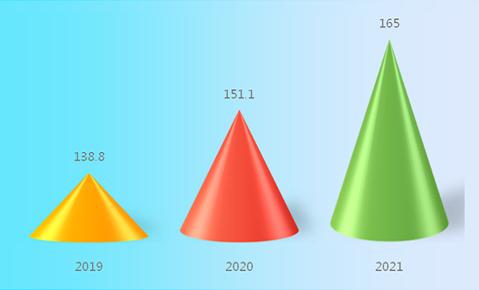 数据显示, 2019年中国高尔夫球场资产规模从2018年的131.5亿元增长到138.8亿元,2020年中国高尔夫球场资产规模为151.1亿元,2021年资产规模约为165亿元,2018-2021年的复合增长率为7.86%。