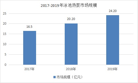数据显示,泳池热泵市场规模为16.5亿元,泳池热泵市场规模为20.2亿元,2019年泳池热泵市场规模为24.2亿元,同比增速为19.8%。