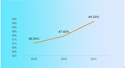 2019-2021年我国应急储备行业资产负债比率由46.54%上升到49.2%。