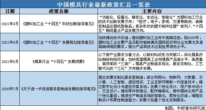 近年来,近年来,相关主管部门出台了一系列激励政策,《塑料加工业“十四五”科技创新指导意见》《塑料加工业“十四五”发展规划指导意见》《模具行业“十四五”发展纲要》等政策,有助于模具行业健康有序发展。 具体政策如下: