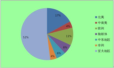 其中亚太地区碳排放量占比为52%,其次分别为北美、中南美、欧洲,碳排放量占比分别为17%、4%、11%。