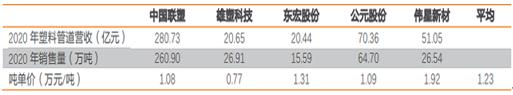 根据中国联塑、雄塑科技、东宏股份、公元股份、伟星新材 2020 年收入及塑料管道销售量,可得塑料管道平均吨单价为 1.23 万元/吨,即 12.3 元/公斤。